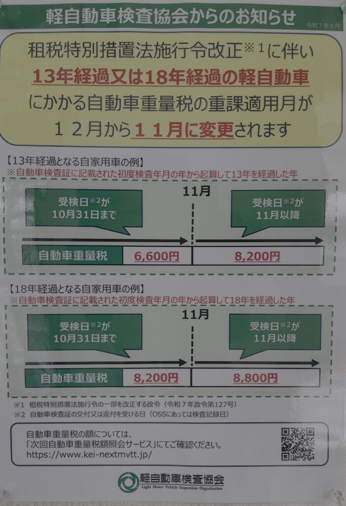 これまで13年・18年を経過した軽自動車の重課(税金アップ)のタイミングは「12月」でしたが、改正後は11月に早まります。
